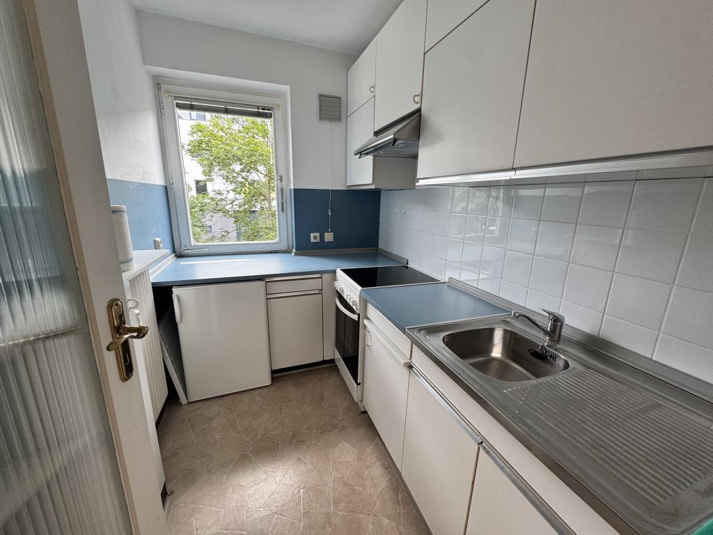 Die schöne Wohnung liegt im 3. Obergeschoss und bietet einen Weitblick in die Kuno-Fischer-Straße. Sie ist bequem mit dem Aufzug erreichbar, der auf dem Zwischenpodest hält. Bis zur Wohnung ist es dann nur noch eine halbe Treppe. Die Einlasskontrolle wird durch eine Gegensprechanlage geregelt. Sowohl die Eingangsdiele als auch der Wohn-/ Schlafraum sind mit einem ansprechendem Buchenlaminat ausgelegt. In der Eingangsdiele ist des weiteren ein praktischer Einbauschrank vorhanden. Von hier geht linker Hand das Badezimmer ab, dass mit Badewanne, Waschtisch inklusive Verspiegelung und WC ausgestattet ist. Der Boden und die Wände (zargenhoch) sind gefliest. Geradezu kommt man in den Wohn-/ Schlafraum, dem ein schöner Balkon in Ostausrichtung vorgelagert ist. Auch hier ist ein Einbauschrank vorhanden. Bodentiefe Tür-/ Fensterelemente sorgen für einen lichtdurchfluteten Wohnbereich, die Raumhöhe liegt bei circa 2,52 m. Die Küche vis á vis der Eingangsdiele ist komplett und funktional ausgestattet. Neben ausreichend Schrankraum stehen ein Herd mit Cerankochfeld, ein Backofen und ein kleiner Kühlschrank mit Gefrierfach zur Verfügung. Der Boden ist mit Linoleum ausgelegt. Ein Kellerabteil mit circa 3,5 m² rundet das Angebot ab. Optional kann auch ein Tiefgaragenplatz für 25.000 Euro erworben werden. Eine Wohnung mit Potential in herrlicher Lage!Energieausweis