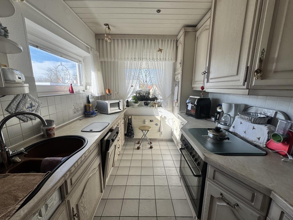 Die Wohnung verfügt über eine großzügige Eingangsdiele mit praktischem Einbauschrank, von der aus alle Zimmer sowie das Badezimmer und die Küche separat begehbar sind. Das tagesbelichtete Badezimmer liegt direkt zur linken Seite und ist mit einer großen, bodentiefen Dusche, WC und Waschtisch ausgestattet. Es wurde vor ca. 20 Jahren renoviert und überzeugt mit hellen, modernen Elementen und Fliesen. Die helle Einbauküche bietet ausreichend Stauraum in Hängeschränken und ist mit allen wichtigen Elektrogeräten ausgestattet, darunter Herd mit Cerankochfeld, Spülmaschine und Waschmaschine. Die Küche ist im Kaufpreis inbegriffen. Das großzügige, helle Wohnzimmer ist praktisch geschnitten und lässt vielfältige Einrichtungsmöglichkeiten zu. Von hier aus gelangt man auf den sonnigen Balkon in Süd-West-Ausrichtung. Auch das große Schlafzimmer ist gut geschnitten und bietet genügend Platz für ein großes Bett sowie ausreichend Schrankraum. Zur Wohnung gehört ein Kellerraum mit Sondernutzungsrecht. Zahlreiche weitere Kellerräume stehen zur gemeinschaftlichen Nutzung zur Verfügung. Hinweis zum Stellplatz: Ein Fahrzeugstellplatz steht zur Nutzung zur Verfügung, gehört jedoch nicht zur Wohnung. Hinweis zu den KI-generierten Fotos: so KÖNNTE die Wohnung nach ein paar Änderungen Ihrerseits aussehen....Energieausweis